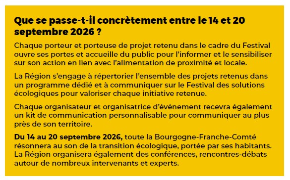 Ouvert à tous les habitants et habitantes de Bourgogne-Franche-Comté qui souhaitent devenir « porteur de solutions » et contribuer à l’accélération de la transition écologique, ce Festival aura lieu du 14 au 20 septembre 2026 dans tout le territoire.